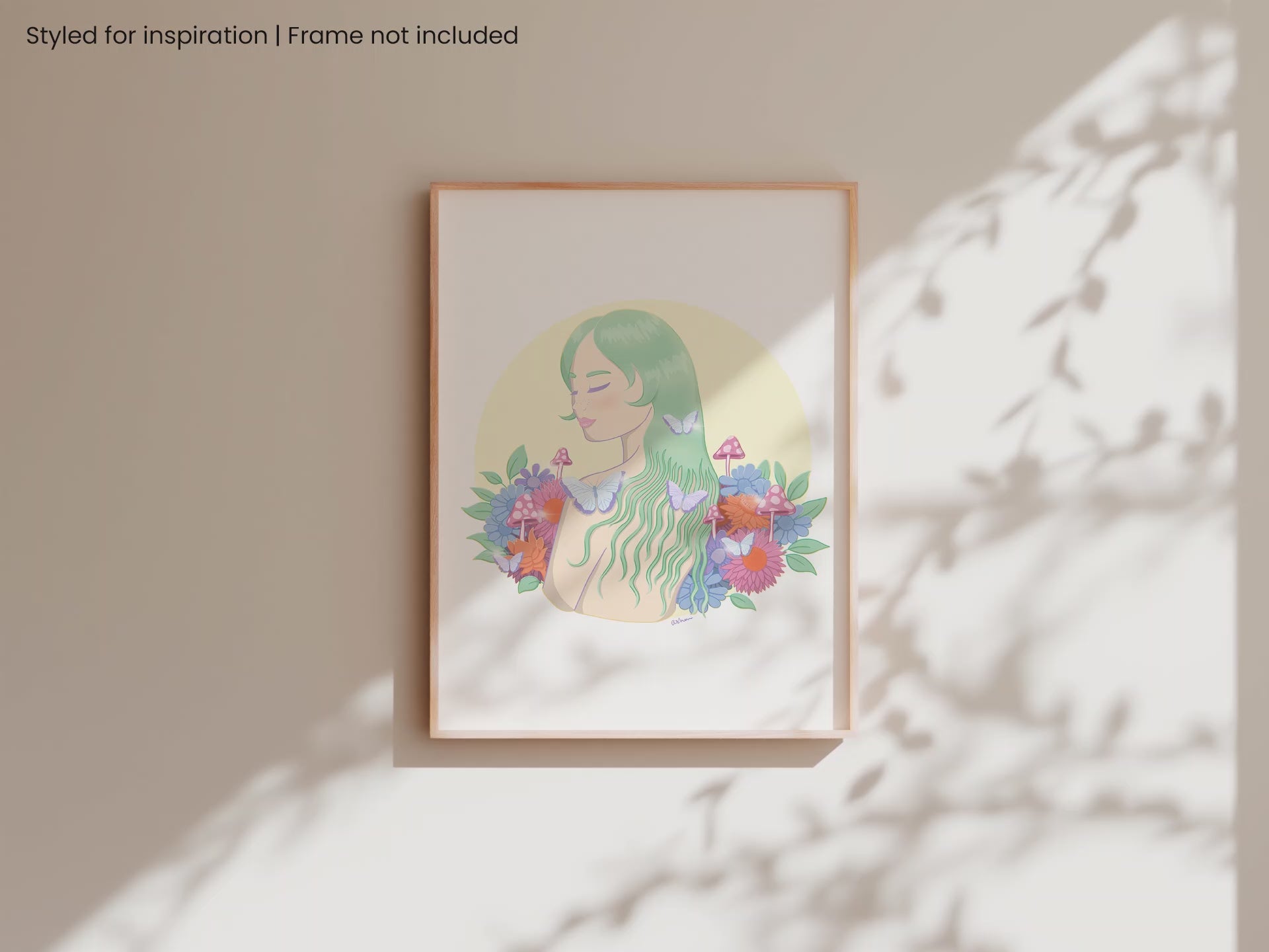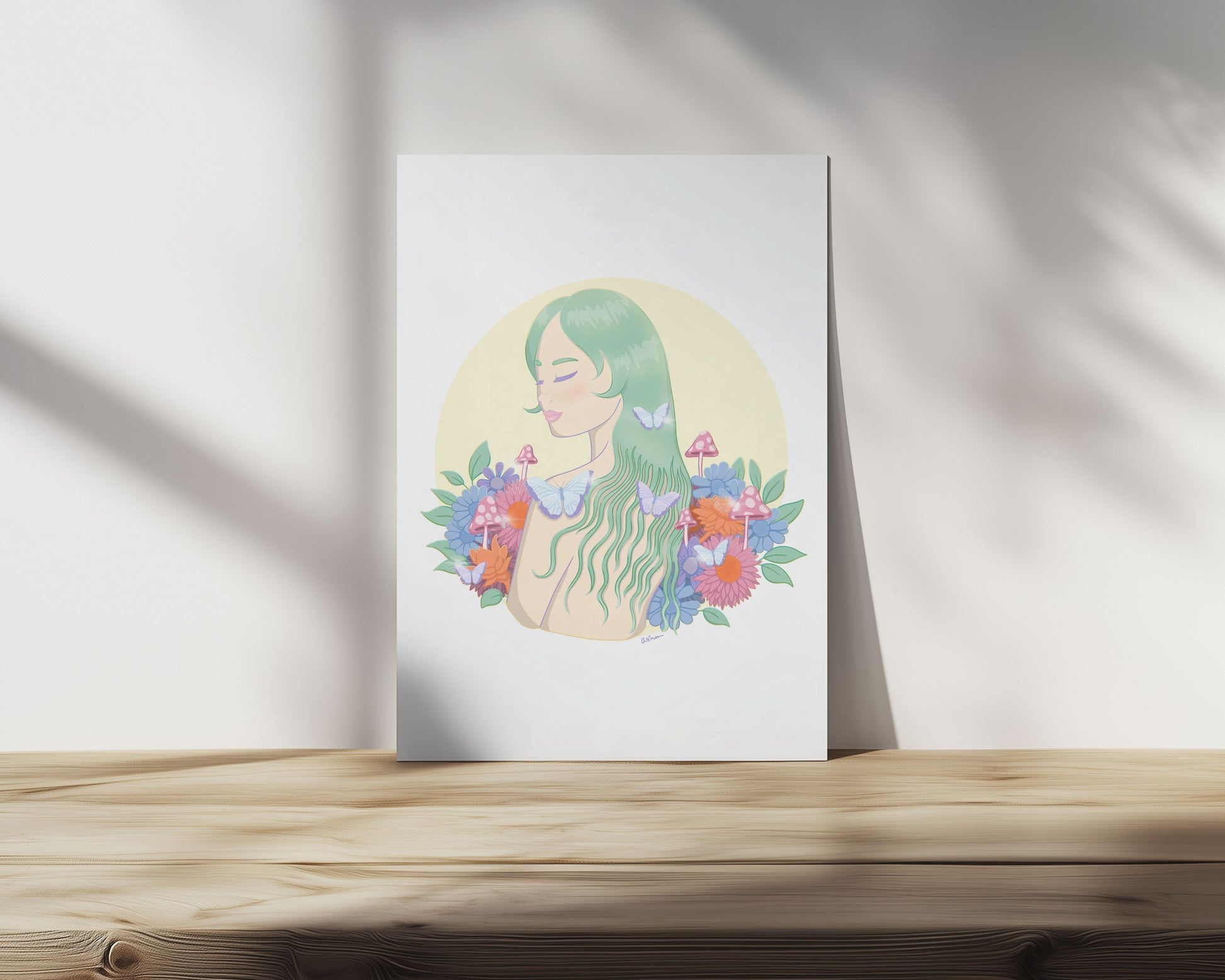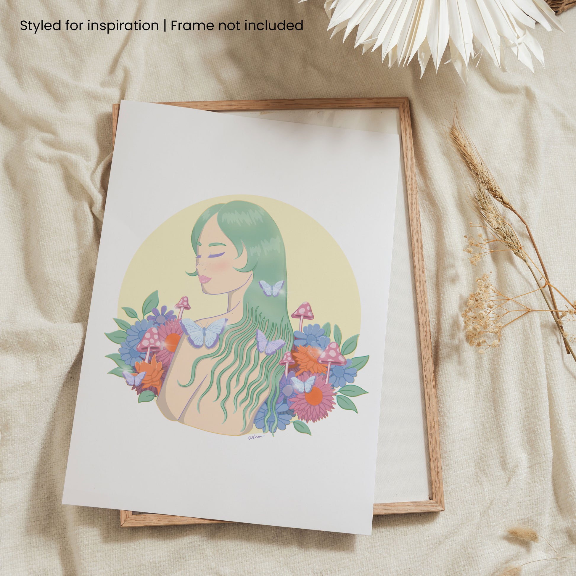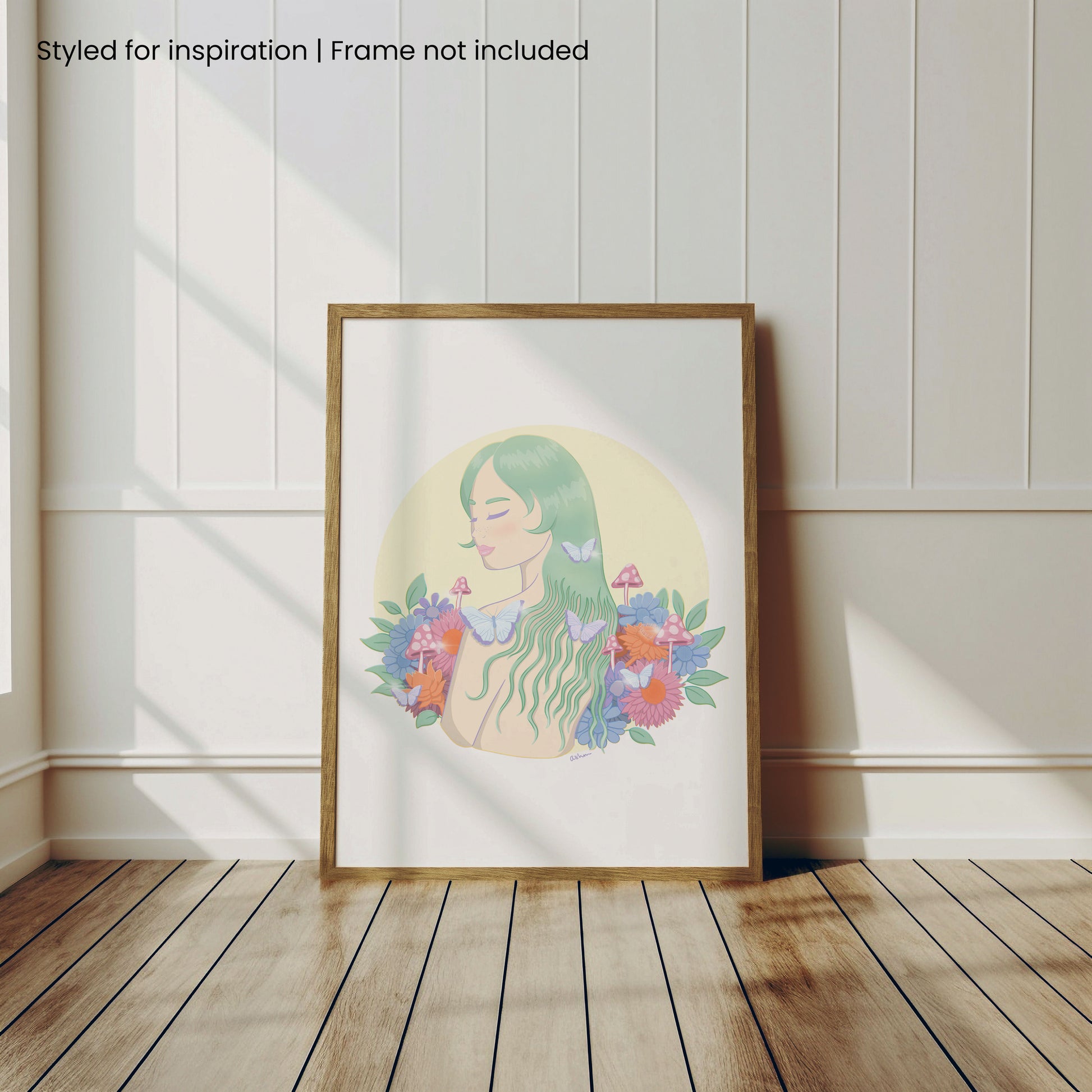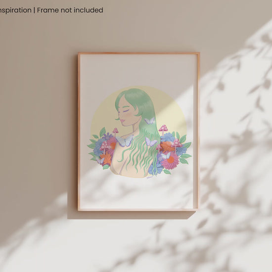 This dreamy illustration celebrates finding peace in nature - a refuge away from modern life where expectations fall away and you can simply exist with the Earth. With flowing mint hair, delicate butterflies, and a bouquet of vibrant blooms and mushrooms, she embodies the freedom to be both wild and gentle, untamed yet at ease.