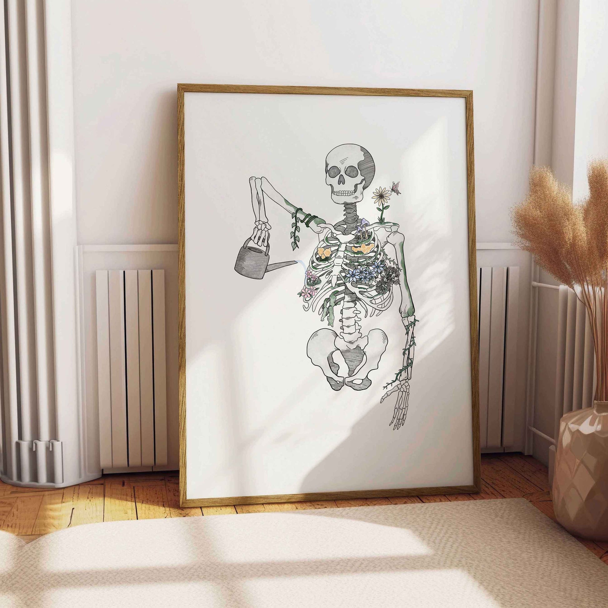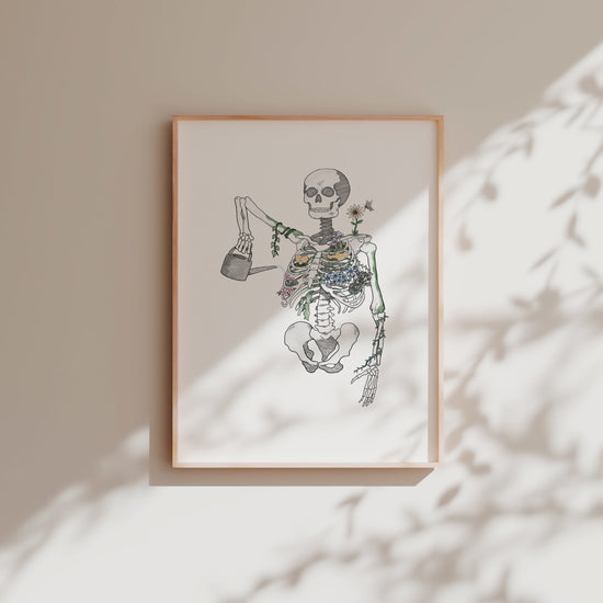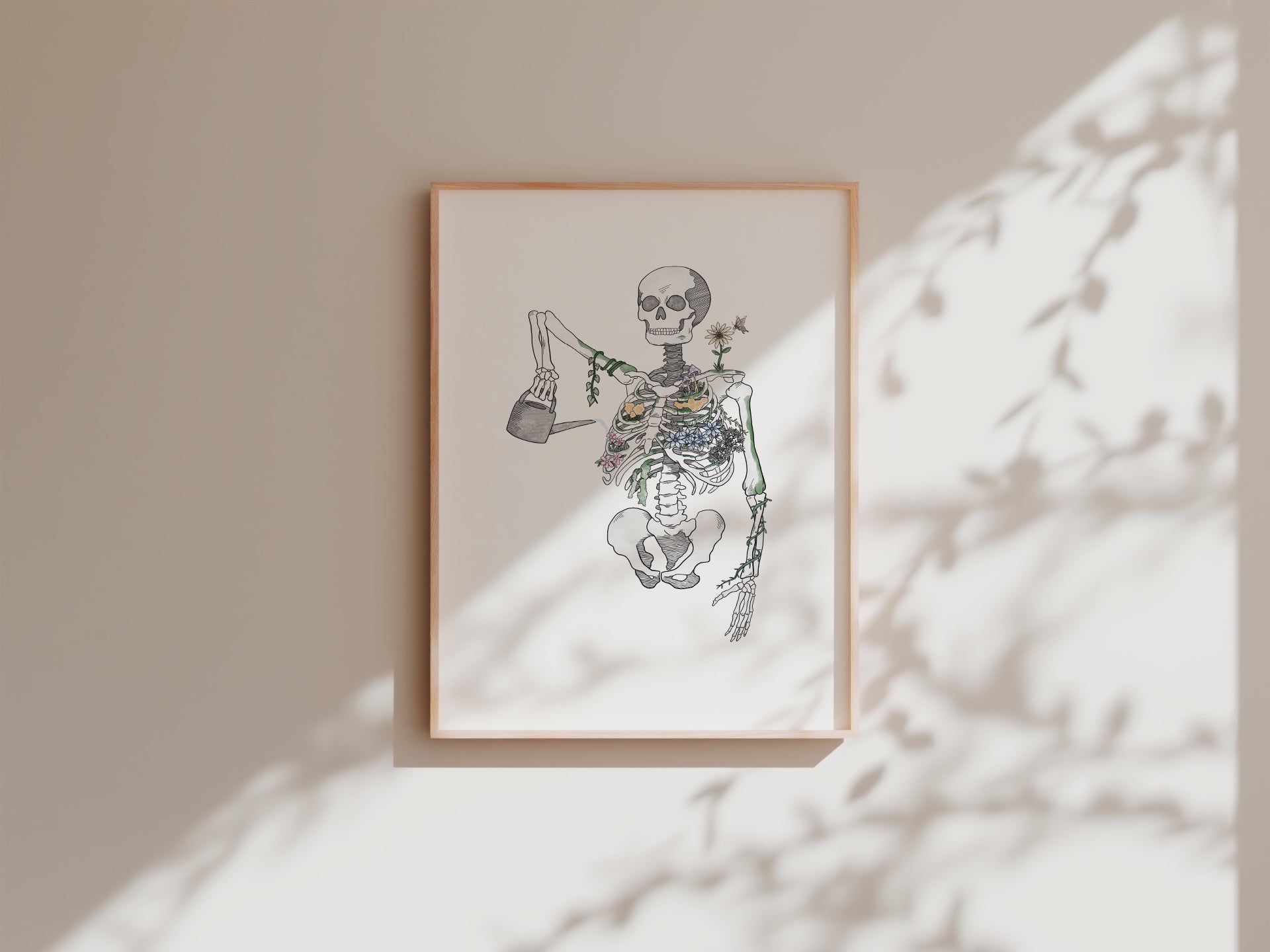 A hand-drawn skeleton entwined with flowers and greenery, symbolising the beauty of growth through hard things - the quiet resilience that blooms even when you feel a little dead inside.
